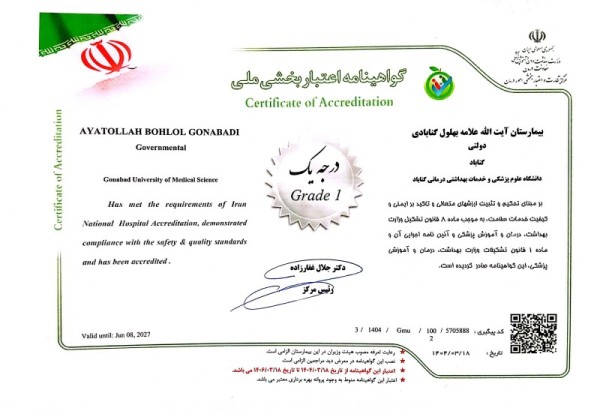 به گزارش روابط عمومی مرکز آموزشی، پژوهشی و درمانی علامه بهلول گنابادی، دکتر محسن صاحبان ملکی رئیس مرکز آموزشی، پژوهشی و درمانی علامه بهلول گنابادی گفت: با اعلام دفتر نظارت و اعتباربخشی امور درمان معاونت درمان وزارت بهداشت، درمان و آموزش پزشکی و بر اساس ارزیابی های انجام شده توسط کارشناسان اداره مدیریت نظارت و اعتباربخشی وزارت بهداشت از بیمارستان علامه بهلول گنابادی، این بیمارستان موفق شد برای یک دوره متوالی دیگر عنوان «درجه یک» اعتباربخشی ملی را کسب نماید.